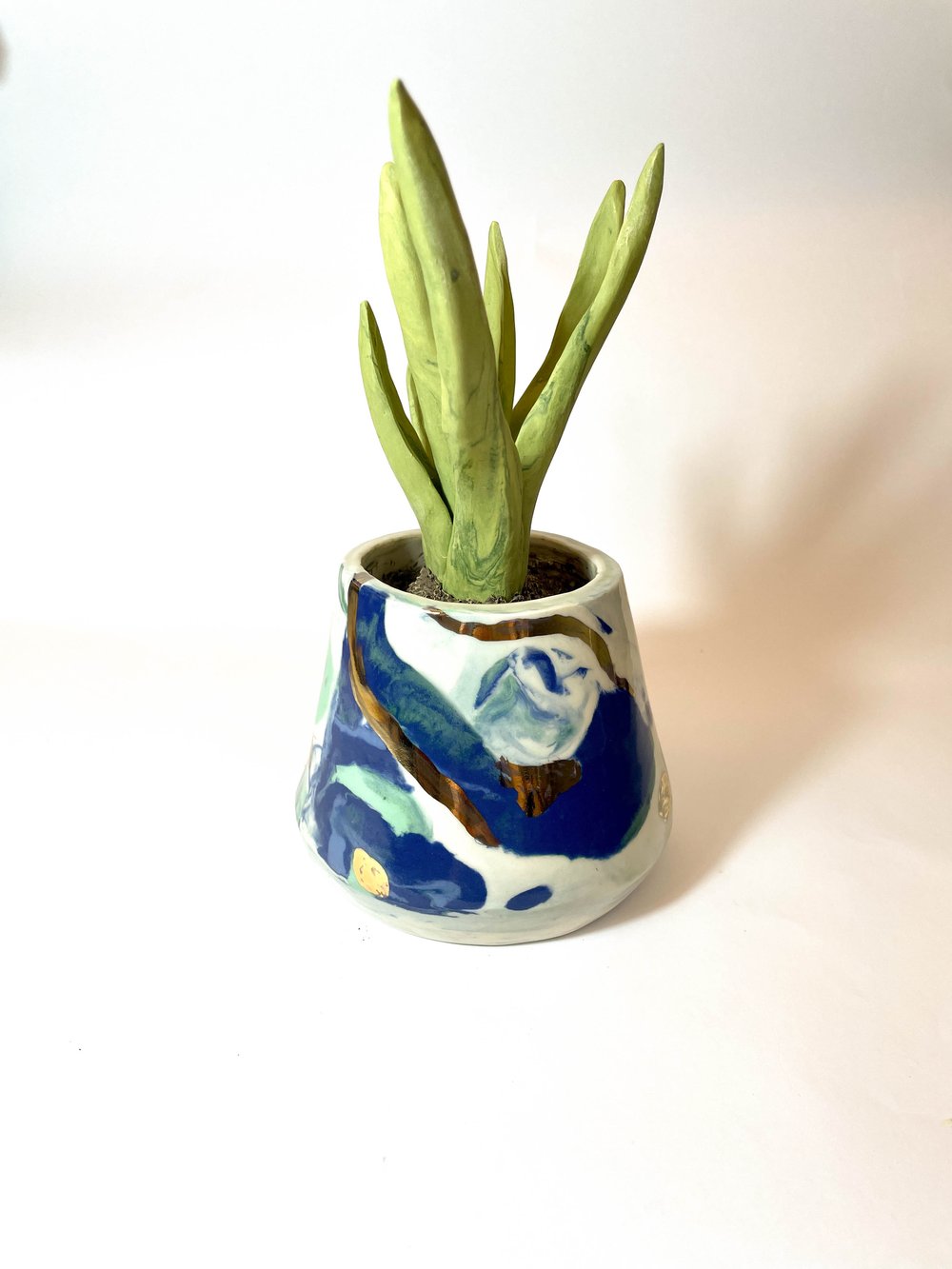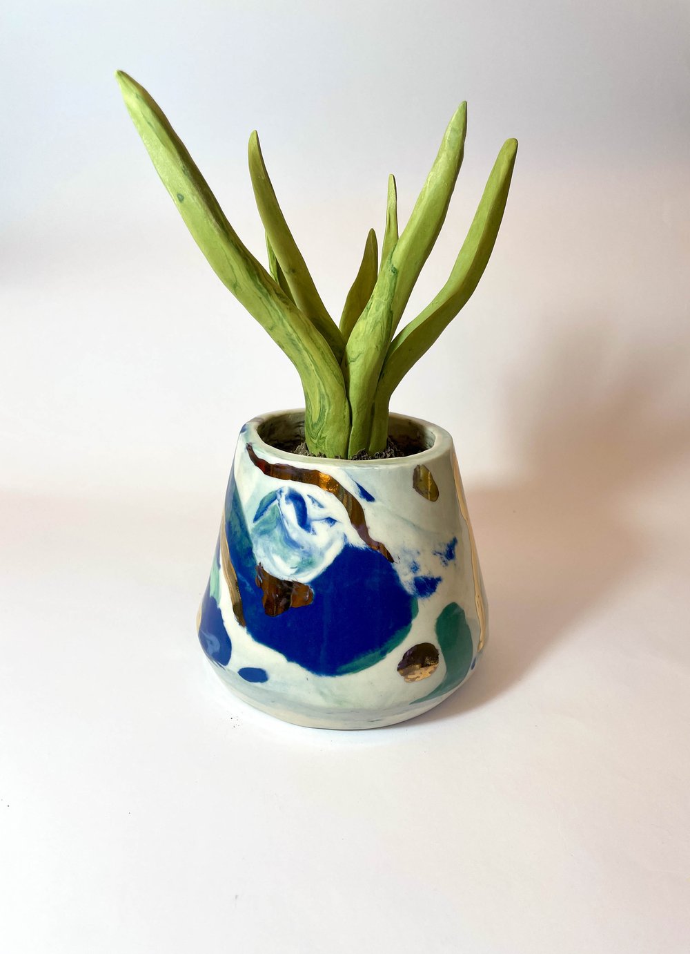 This is a handmade ceramic plant sculpture with a tapered cylindrical base. It measures approximately 8.5 in. in height and 4.5 in. width. The colors and patterns created using a Japanese technique called nerikomi. All the color you see is made by hand mixing stains into the clay body. The base also contains accents of real gold.