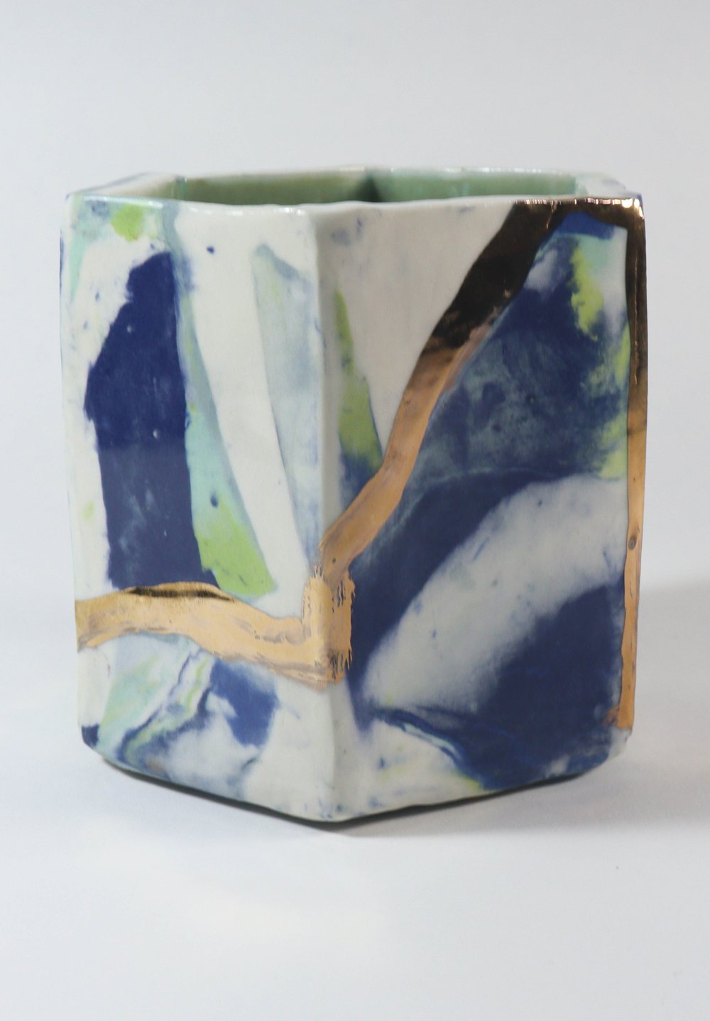 Blue and green abstract patterns adorn the outside of this small planter with accents of real gold! Measuring 3.75" x 4" with a 3" opening, this is a charming ceramic vessel for a plant. This item is handmade using a porcelain clay, stains and a Japanese technique called nerikomi.