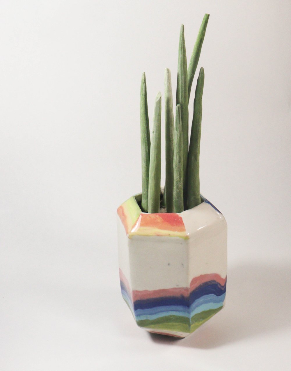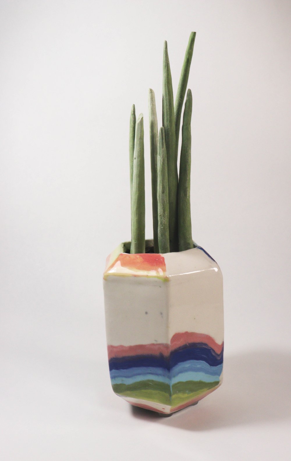 This is a handmade ceramic plant sculpture with a hexagonal base. It measures approximately 11 in. in height and 3 in. in width and depth. The colors and patterns created using a Japanese technique called nerikomi. All the color you see is made by hand mixing stains into the clay body.