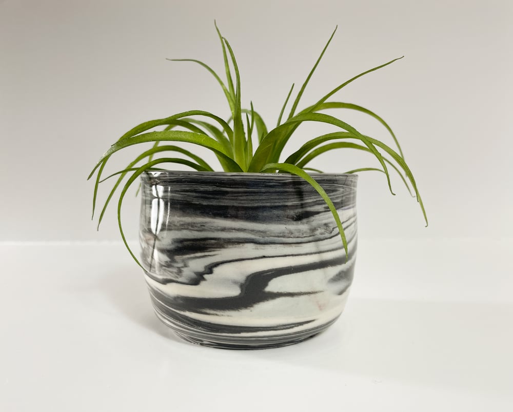 This is a small black and white marbled porcelain planter. This planter measures approximately 3.25" in width and 2.5" in height. There is no drainage hole on the bottom so it's perfect for an airplant, succulent, or any other plant that doesn't need much watering!